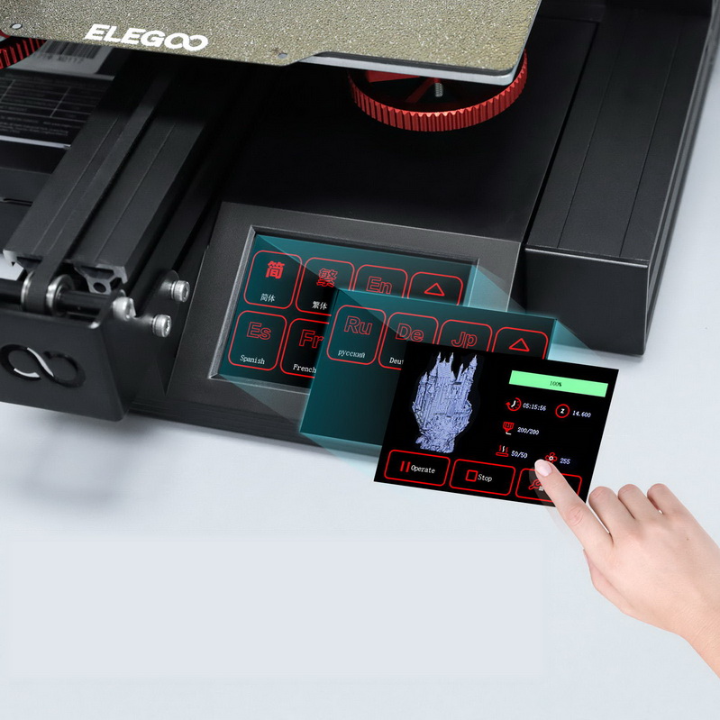 Управление принтером реализовано через цветной тачскрин с удобным пользовательским интерфейсом и поддержкой 4-х языков, включая русский. Загрузка файлов осуществляется через USB. Можно работать и в автономном режиме, с карты памяти SD. Neptune 2S совместим с популярным слайсером Cura.