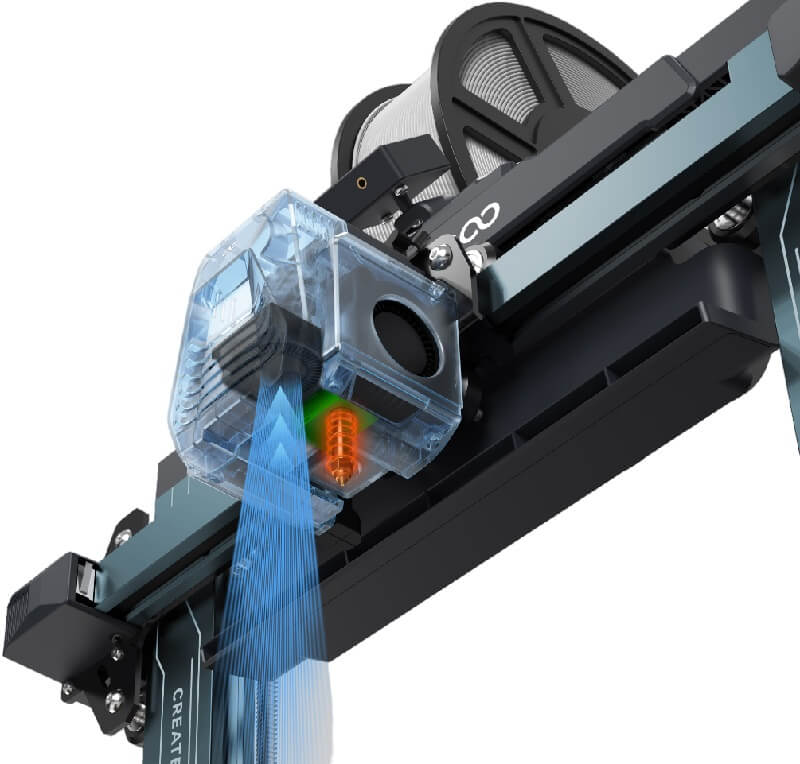 Модель Neptune 4 Pro имеет мощную систему охлаждения, состоящую из модуля отвода тепла и интеллектуальной системы контроля обдува. Также в систему входит вспомогательный модуль рассеивания тепла с 4 вентиляторами, которые обеспечивают ускоренный отвод тепла в режиме быстрой печати. После завершения печати обдув отключается автоматически.