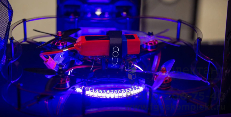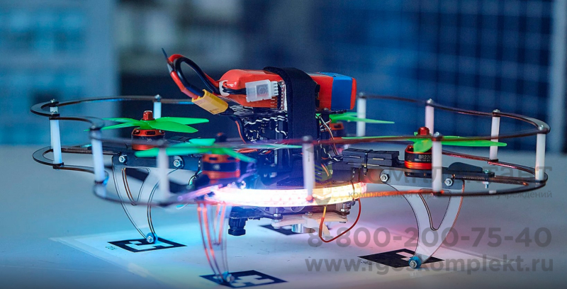 Карбоновая рама, защита опор, мощные бесколлекторные двигатели, полетник PX4, Raspberry Pi 4, программируемая светодиодная полоса, камера машинного зрения, лазерный дальномер, навигация в помещении, аккумулятор с увеличенной емкостью.