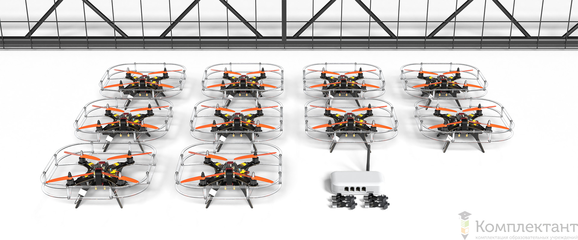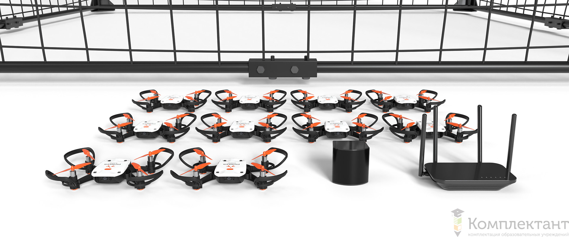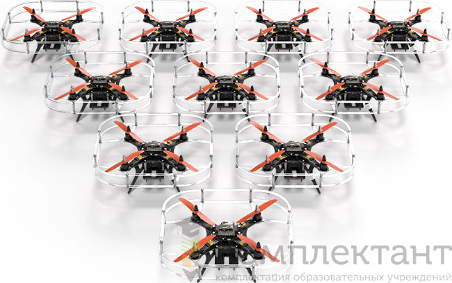 Набор включает 10 образовательных квадрокоптеров (Пионер Базовый или Пионер Мини), а также все необходимое для организации группового полета дронов в помещении. С его помощью учащиеся школ, колледжей и вузов могут отрабатывать алгоритмы роевого интеллекта, экспериментировать с выполнением задач навигации и распределенных вычислений. Комплект будет особенно полезен на занятиях по робототехнике или при организации соревнований.