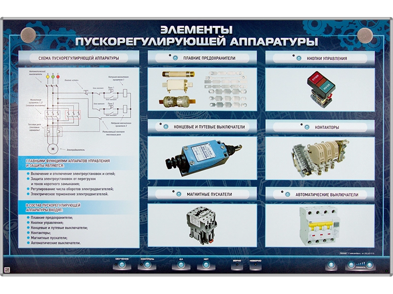 Электрифицированный стенд "Элементы пускорегулирующей аппаратуры" представляет собой полноцветную светодинамическую панель, на которой отображена информация о назначении и выполняемых функциях. Представлены схемы включения, принцип работы, классификация пускорегулирующей аппаратуры.