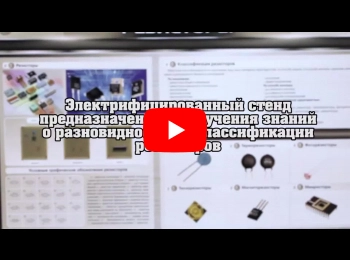 Электрифицированный стенд "Резисторы" представляет собой полноцветную светодинамическую панель, на которой отображена информация о разновидностях и классификации резисторов. Также на стенде присутствуют макетные образцы резисторов. В конструкцию учебного оборудования интегрированы высокочувствительные сенсоры для управления стендом при помощи интерактивного воздействия приемо-передающих устройств. Предусмотрено два режима работы со стендом: "Обучение" и "Контроль".