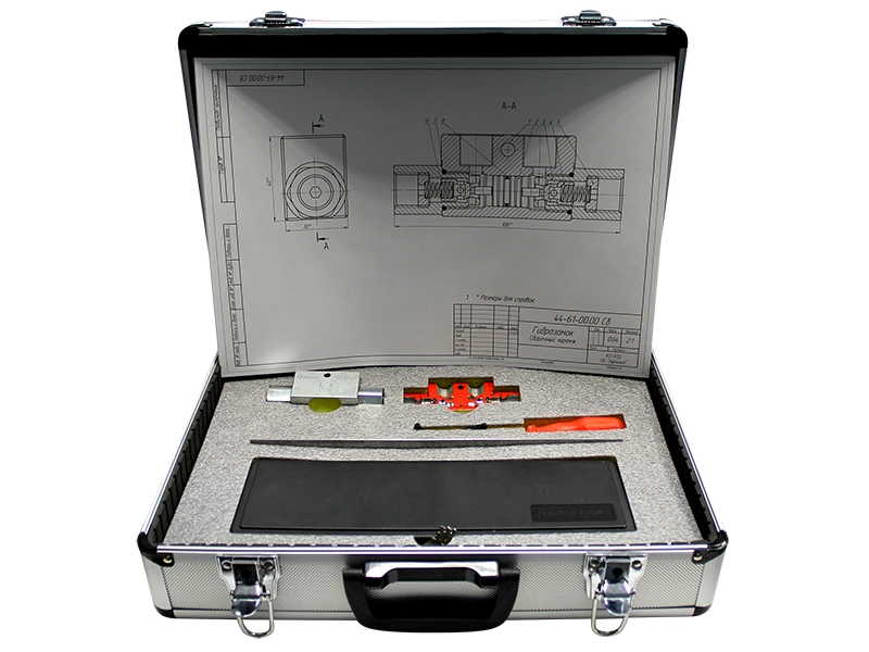Комплекс представляет собой кейс с комплектом, состоящим из разрезной и натурной моделей гидрозамка (устройство для удержания гидравлических двигателей в статическом положении под нагрузкой), наборов слесарных и измерительных инструментов и комплекта чертежей элементов устройства. Комплекс позволяет производить: