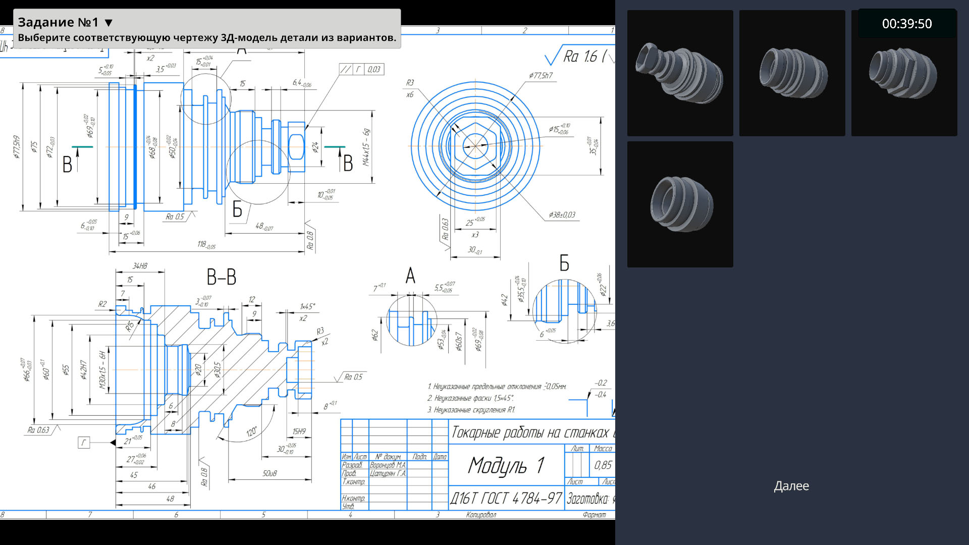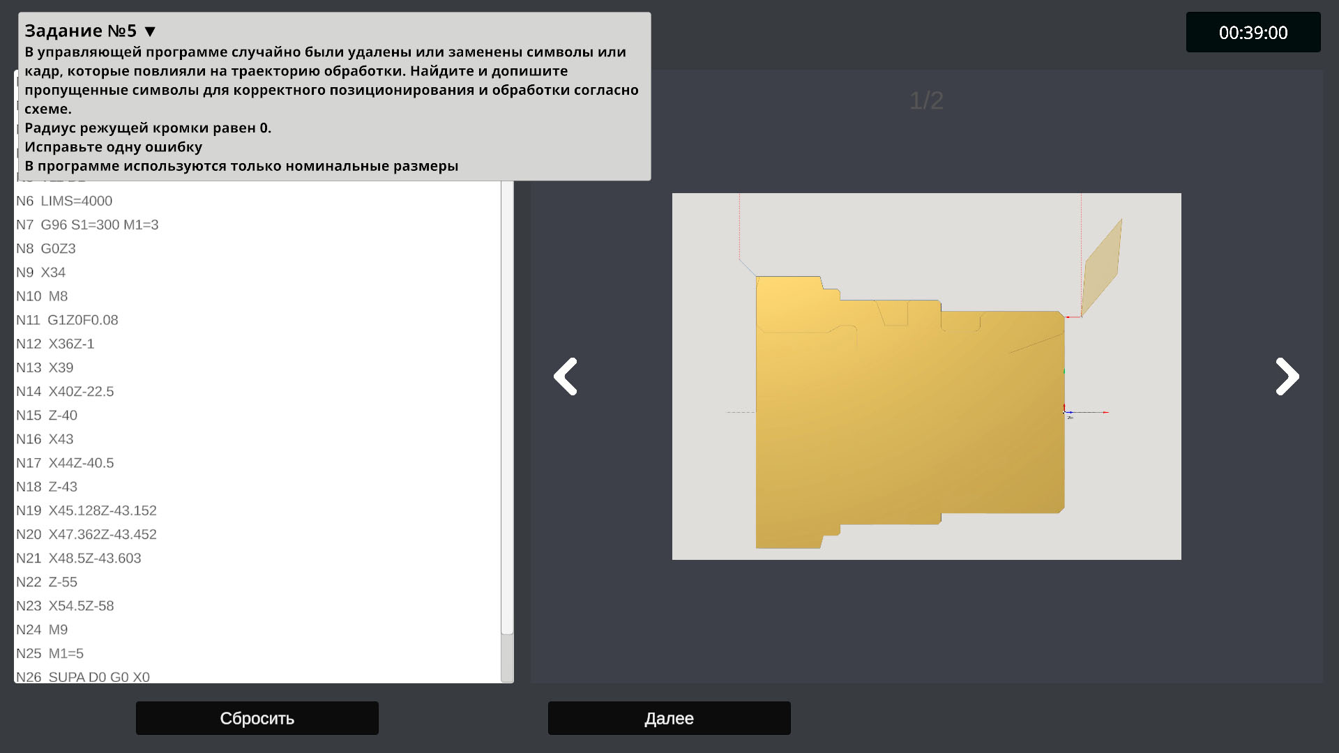 Пользователю необходимо выполнить задания по подбору режущего инструмента, режимов обработки, определить правильность выполненных размеров и форм и скорректировать параметры режущего инструмента и нулевой точки детали.