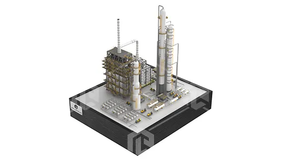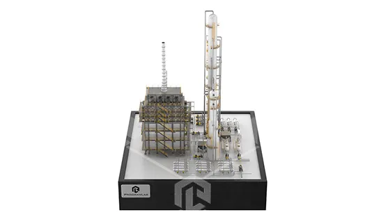 Макет колонны атмосферной перегонки нефти выполнен из профессиональных листовых и легкообрабатываемых материалов с применением технологий FDM и SLA печати, отдельные элементы созданы на ЧПУ станках, позволяет наглядно изучить устройство и элементы колонны атмосферной перегонки нефти, содержит экспликацию оборудования.
