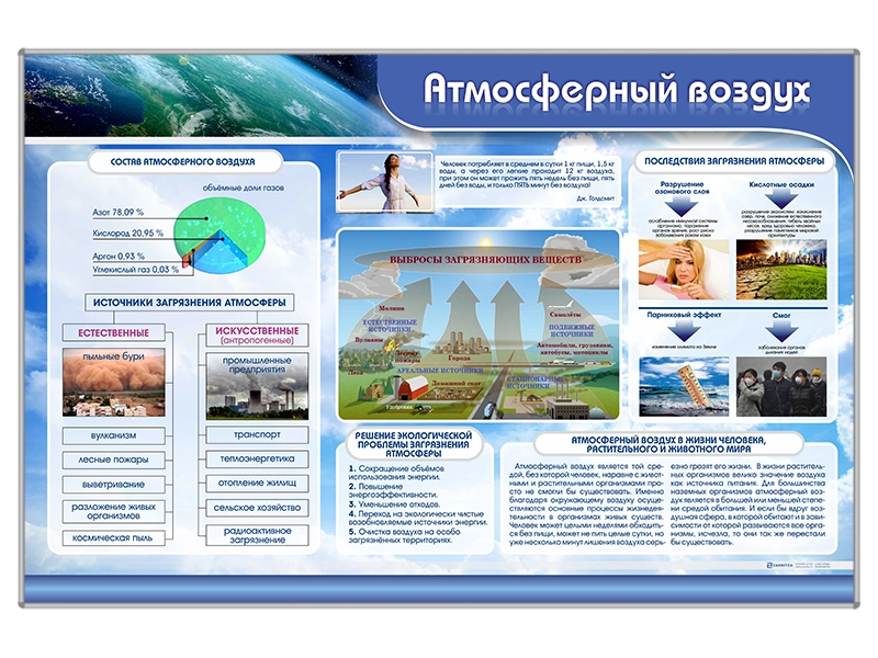 Учебный стенд представляет собой полноцветную информационную панель с информацией об атмосферном воздухе как объекте экологических отношений.