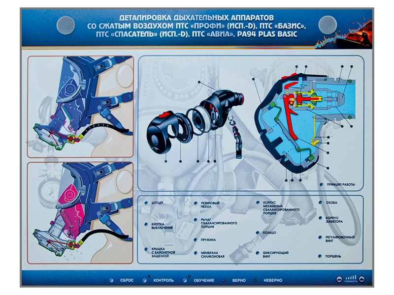 Комплект представляет собой набор из 6 электромеханических стендов, интегрированных в секционно-кассетный презентационный модуль. Каждый стенд представляет собой информационную панель со световой индикацией. На стендах изображены устройства дыхательных аппаратов со сжатым воздухом в следующих представлениях: