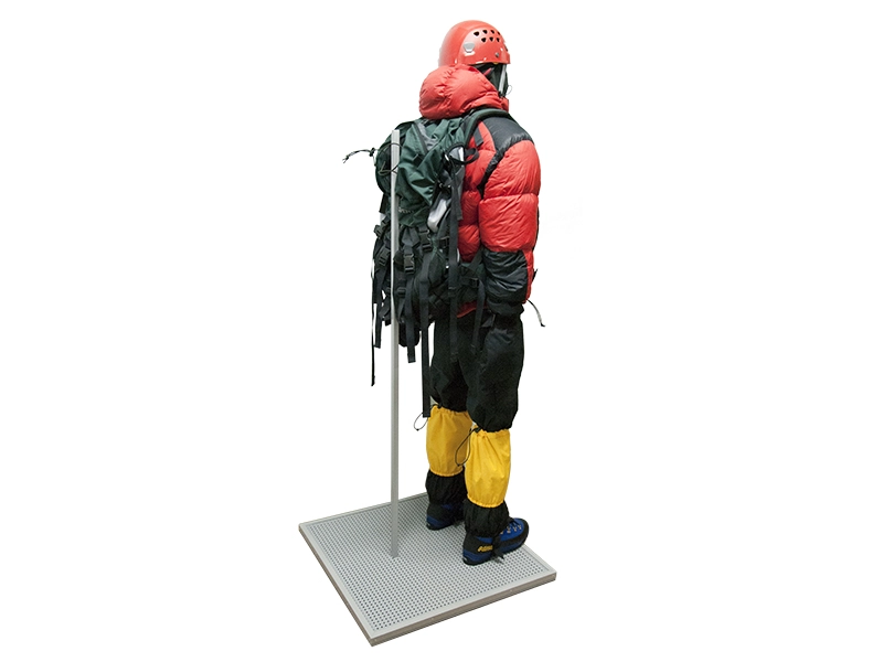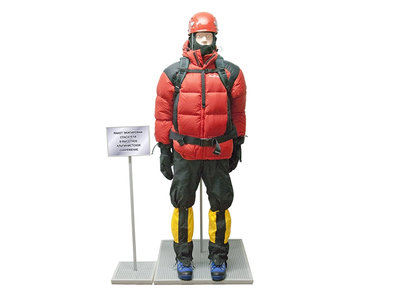 Наглядный макет экипировки спасателя "Зимняя одежда и высотный альпинизм" представляет собой стоячий манекен, экипированный в высотное альпинистское снаряжение: