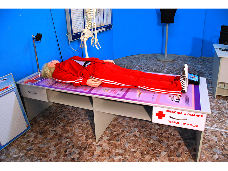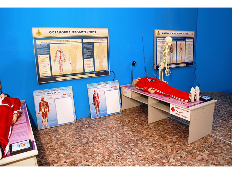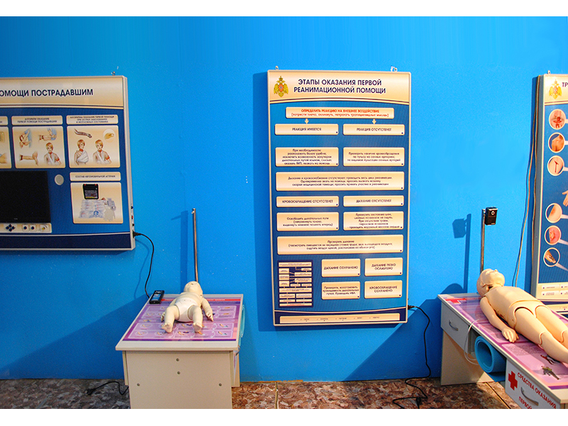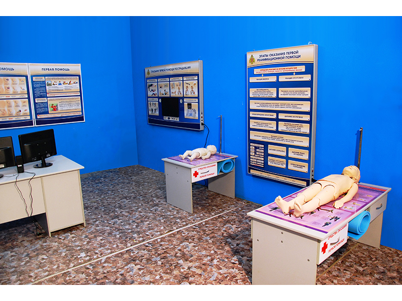 Многофункциональный учебно-тренажерный комплекс представляет собой комплект взаимосвязанного оборудования, направленного на повышение эффективности подготовки к оказанию первой помощи на месте происшествия. В комплект оборудования входят тренажеры-манекены разного пола и возраста, что позволяет наиболее полно охватить весь спектр реанимационного воздействия на пострадавших. Контроль над правильностью выполнения реанимационных мероприятий осуществляется с рабочего места преподавателя на персональном компьютере по беспроводному каналу связи и на панели контроля и управления сотрудника. Для отработки навыков оказания первой помощи после реанимационных мероприятий (остановки кровотечения, первой помощи при ожогах, переломах и т.д.) представлены наглядные и электрифицированные интерактивные стенды.
