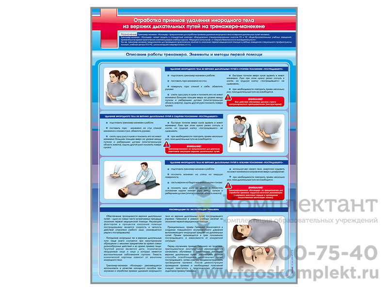 Стенд предназначен для наглядного отображения информации о приемах удаления инородного тела из верхних дыхательных путей на тренажере-манекене, а также для формирования у учащихся, курсантов или сотрудников предприятий знаний об оказании первой помощи.