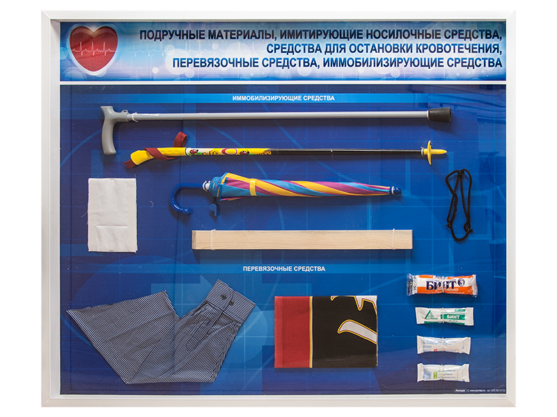 Стенды "Подручные материалы, имитирующие носилочные средства, средства для остановки кровотечения, перевязочные средства, иммобилизирующие средства" (образцы под оргстеклом)