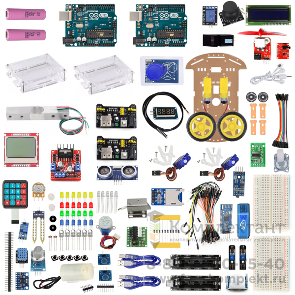 Базовый робототехнический набор для конструирования, изучения электроники и микропроцессоров и информационных систем и устройств (электронные устройства (датчики, моторы, сервомоторы)