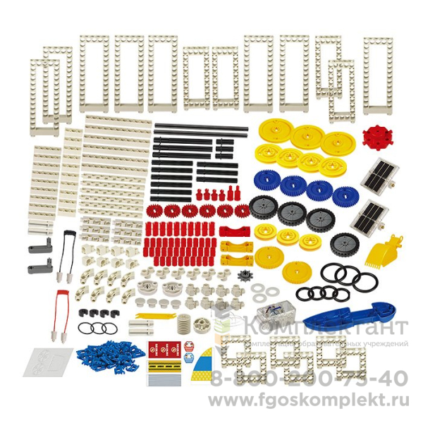 балки, оси, мотор, шестеренки, колеса, корпус лодки, солнечные батареи, соединительные детали и т.д.