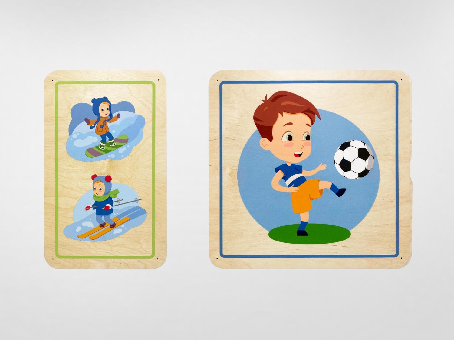 Дополнительные модули бывают однотонные и с тематическими иллюстрациями, подходящими под тематику дидактических панелей. Разнообразие размеров способствует декорированию стен различной конфигурации и масштабов. Параметры варьируются от совсем маленьких модулей 300х300 мм до крупных размеров 600х600 мм.