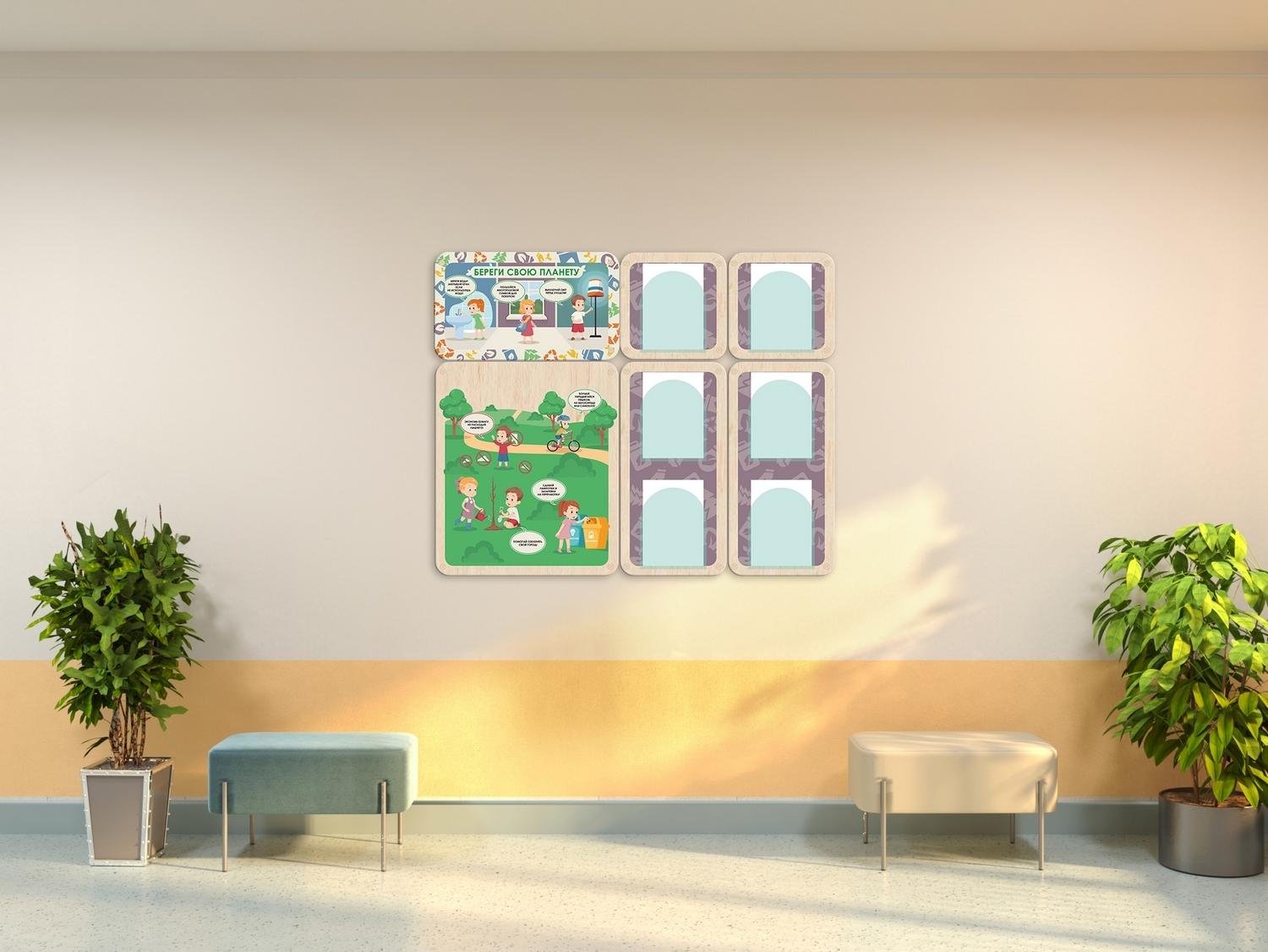 Информационный стенд для оформления стен в детских садах, начальной школе и организациях дополнительного образования. Красочные наглядные иллюстрации с простыми подписями помогут дошколятам понять правила экологичного поведения, даже если они ещё не умеют читать. Важная информация для родителей может размещаться в акриловых карманах около каждого стенда.