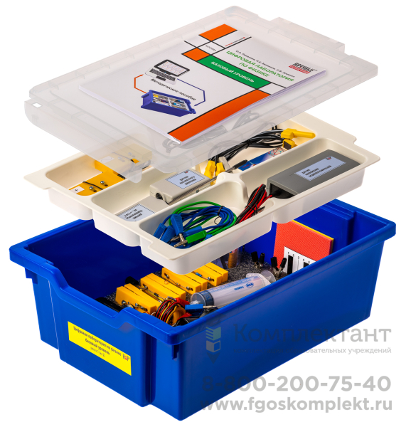 Все оборудование цифровой лаборатории (кроме скамьи) укомплектовано в специальные пластиковые контейнеры, которые закрываются прозрачной пластиковой крышкой. Комплект оборудования и датчики в контейнерах располагаются на ложементах в индивидуальных ячейках. Скамья имеет отдельную упаковку