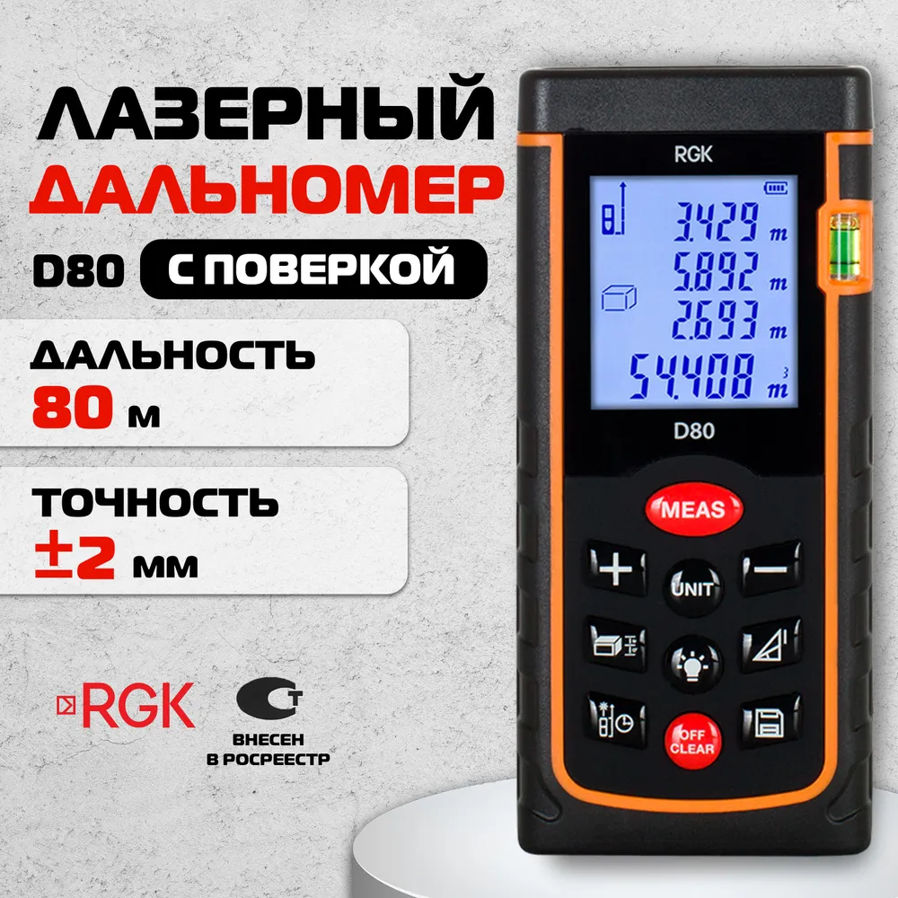 Описание Лазерный дальномер RGK D80 с поверкой – современный прибор профессионального уровня, предназначенный для измерения расстояний в помещении и на улице. Диапазон измерений – до 80 метров, точность при этом составляет ± 2 мм. Функционал Широкий набор функций лазерного дальномера RGK D80 существенно упрощает и ускоряет процесс измерений: Расчёт периметра, площади и объёма помещения. Функция Пифагора поможет измерить недоступные расстояния. Непрерывные измерения. Данная функция позволит отмерить необходимое расстояние до объекта или произвести вынос точек. Определение минимума и максимума поможет, например, при измерении диагоналей или расстояний до нескольких объектов. Сложение и вычитание избавит вас от необходимости производить расчёты в уме или использовать калькулятор. Внутренняя память Результаты измерений сохраняются во внутренней памяти лазерного дальномера RGK D80 – до 99 значений. Просмотреть их можно непосредственно на экране самого прибора. Это существенно упрощает анализ полученных значений. Точки отсчёта При включении прибора по умолчанию устанавливается точка отсчёта от нижней грани корпуса лазерного дальномера RGK D80. Помимо неё доступно ещё три: Откидная скоба – для измерений от внутренних углов. Центр – для работы со штативом. Передняя грань корпуса – для измерений от внешних углов. Экран Прибор оснащён ярким четырёх-строчным жидкокристаллическим дисплеем. На нем одновременно отображаются текущие значения измерений, а также 3 предыдущих. Кроме того, на экране лазерной рулетки RGK D80 отображается информация о режиме работы прибора и индикатор заряда аккумулятора. Для удобства работы при недостаточном освещении предусмотрена подсветка, которая активируется нажатием соответствующей клавиши. Питание Работает лазерная рулетка RGK D80 от двух батареек типа ААА на 1.5. Одного заряда элементов питания хватает на 8000 измерений. Продлить срок службы аккумуляторов позволяет функция автоматического отключения прибора после 2,5 минут простоя. Корпус Прочный прорезиненный корпус лазерной рулетки RGK D80 обеспечивает пыле-влагозащиту прибора в соответствии с классом IP54. Это позволяет использовать его даже в сильно запылённых помещениях и при повышенной влажности. Кроме того, дальномер может выдерживать падения с высоты до 1 метра. Комплектация Лазерный дальномер RGK D80 с поверкой Чехол Элементы питания Инструкция Характеристики Общие Гарантия 1 год Технические свойства Погрешность измерения ±2 мм Класс защиты IP54 Дальность измерения, м 80 Мин. температура, °С 0 Макс. температура, °С +40 Функции: Вычисление объема, Вычисление площади, Непрерывное измерение расстояния, Разовое измерение расстояния, Сложение и вычитание площадей Особенности Особенности: Автоматическое выключение, Встроенный уровень, Индикатор низкого заряда батарей, Крепление для штатива, Подсветка, Сохранение измерений